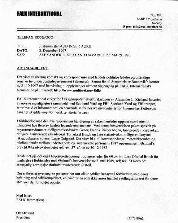 FALK International and its president Ole Ostlund has for years urged Norwegian authorities to contact FBI and Scotland Yard for information and support about the terrorist act on "Kielland" as the Norwegian Prime Prosecutor has proven to be incompetent in this matter. Ref summary in telefax of December 3rd 1997 from FALK International to the Minister of Justice at that time, Aud Inger Aure, and previous and later correspondance to Prime Ministers and Minister of Justice, ref Whats New under the list of updates.