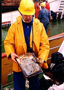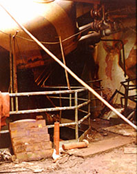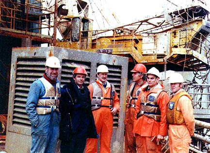 The deck and broken piping from the silos were covered by some brownish stuff which looked like mud. Samples were taken for examination. Tests performed at Rogalandsforskning gave no reliable answer. The ceiling of the deck was however not covered by this stuff. Conclusivly the stuff had not been floating around while the platforme was capsized. It is likely to believe that the starboard silos were emptied as part of the clean-up operation. There were signs that the bolts to the manholes on top of starboard silos recently had been opened. From a stability point of view one should expect an equal number of silos filled on each side, port and starboard. Why the starboard silos were filled and not the port ones might have had an effect on the tilting of the platform after the D-leg broke away. The platform tilted and capsized towards staboard. As such this might also have been part of the sabotage operation. Furthermore pictures taken of the platform shortly before the disaster shows the crownblock hanging in the top of the derrick. This further worsened the situation after the platform started tilting. Picture presented in left wing press Klassekampen. Was this also a part of the operation?