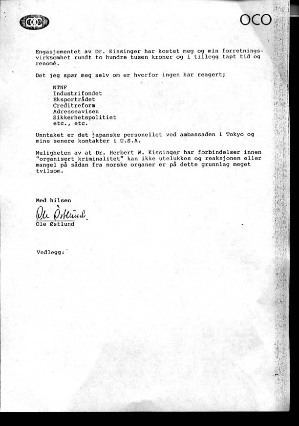 Angående kontakten med Herbert Kissinger vises til anmeldelse