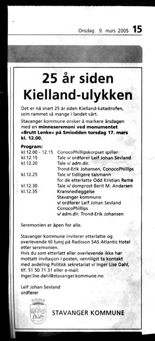 Stavanger Kommune ønsker å markere at det snart er 25 år etter "Kielland" havariet. med en minneseremoni torsdag 17 mars, som annonsert i Adresseavisen 9.mars 2005