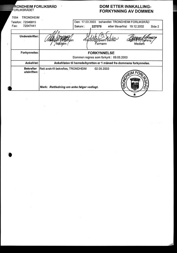 Trondheim Forliksråd (Conciliation Court) avsa 17.03.03 dom i saken mellom Den Norske Bank ASA og Ole Østlund. Forliksrådet fant å se bort fra motkravet fra Østlund mot banken. Motkravet var fundert i at bostyrer i konkursboet til Østlund's firma O.C.Østlund A/S tidligere hadde representert banken i en arrestsak mot et av O.C.Østlund A/S datterselskaper, Skansen Marina A/S, og således aldri skulle vært oppnevnt som bostyrer grunnet inhabilitet. Bankens representant i skiftesamling unnlot mot bedre vitende å påpeke forholdet. Følgene var at bostyrer ikke fulgte opp verdiene i boet, snarere tvert imot. Som styreformann og eneier i selskapet O.C.Østlund A/S anmeldte Østlund bostyrer til politiet for forskussling av boets verdier, dvs økonomisk svindel, uten at dette ble tatt til følge.