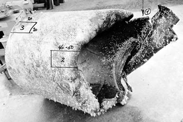 2. How come the deformation and temperature build up in the "Spiral"? The released heating from an explosion is likely rapidly exchanged with the surroundings with the burst of the bracing. The bracing is comparable with a pipe closed in both ends. After explosion in a closed pipe follows implosion. Firstly the underpressure, created by the explosion dragging the air out of the bracing, spreads down the pipe and makes the bracing collapse, sucked in, at a distance from the D-leg where inside underpressure and outside waterpressure are above material carrying capacity. The created underpressure also sucks in the weakened material at the breaking point as shown on the Statoil photos of the D4 breaking point and on the photos of the D4 "cut-off piece". Following the implosion air is sucked back, flows back into the bracing in order to equalize air pressure back to atmosphere. The air flowing back into the pipe creates frictional force and corresponding temperature rise into the material. The air tears of the outside epoxy as shown by the corroded material at slashes and breaking point on photo 2.1.4. The back streaming air twists the "Spiral", tears of the outside epoxy and by force and friction-heating deforms the fractured surface (B) of the "Spiral" developing gradually the typical strong sheerzone and smoothening the surface. The friction heat spreads through the material and carbonizes the inside epoxy of the "Spiral".