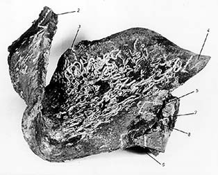 Chemical analyses of both test pieces proved the steel quality to be within the given material specification for Alexander L. Kielland corresponding to the material from other breaking points referred to in the Statoil reports. All test samples, the "reference piece" and seven samples from the "major test piece", ref. photo 2.2.3 were examined by a Reichert MeF3 metalmicroscope at 16-500 magnification. The steel structure of the basic material, "reference piece", is shown in photo 2.2.4. Further examination of selected areas was performed by a JEM 2000A electronmicroscope. Bainitt was found in all the seven samples from the "major test piece" as shown in photo 2.2.5, but not in the "reference piece". Hardness tests further confirmed the identification of bainitt. Twins were found in some of the samples but only on one side of the steel plate as shown in photo 2.2.6.
