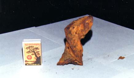 Test samples from the "Spiral" and the "Rondell" were chemical tested for material property purpose and compared to material from bracing D6 as reference. The "Spiral" was conform with D6. The "Rondell" deviated on carbon and vanadium compared to D6 but corresponded with test samples from D3 taken at the node close to the D-leg. This substantiates that the "Rondell" comes from a part of bracing D4 at node 4. Steel quality at the nodes differed from rest of the bracings for strength and welding purposes. Samples of the "Rondell" and "Spiral" are shown on photo 2.3.7 and photos 2.3.8 and 2.3.9.. One of the steel samples from the "Spiral" was examined metallografic with reference to testpoints outlined in fig. 2.3.3.