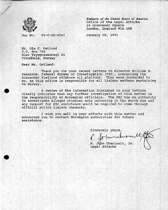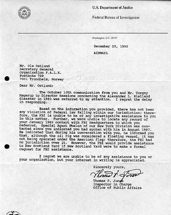 FALK International and its president Ole Ostlund has for years urged Norwegian authorities to contact FBI and Scotland Yard for information and support about the terrorist act on "Kielland" as the Norwegian Prime Prosecutor has proven to be incompetent in this matter. Ref summary in telefax of December 3rd 1997 from FALK International to the Minister of Justice at that time, Aud Inger Aure, and previous and later correspondance to Prime Ministers and Minister of Justice, ref Whats New under the list of updates.