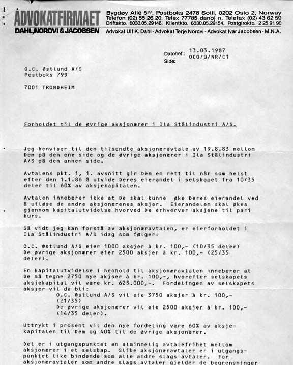 Ole Østlund medundertegnet salg/kjøpsavtalen på vegne av A/S Ila Stålindustri. Aksjekapitalen i A/S Ila Stålindustri utgjorde kr. 350.000 hvorav Ole Østlund's selskap O.C.Østlund A/S inngikk som hovedaksjonær med kr. 100.000. Der ble ingått en aksjonæravtale mellom O.C.Østlund A/S og de andre aksjonærene. Aksjonæravtalen ga O.C.Østlund A/S rett til i tiden fra 01.01.1986 å utvide sin eierandel i selskapet til 60% ved tegning av aksjer til pari kurs pålydende kr. 100,- pr aksje.
