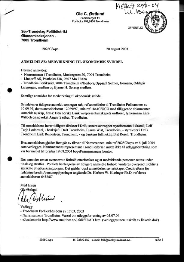 Jeg har når dette skrives 14. nov 2004 enda ikke mottatt påtalemaktens bekreftelse på min Anmeldelse av 20.08.2004, ref: Anm200804.jpg