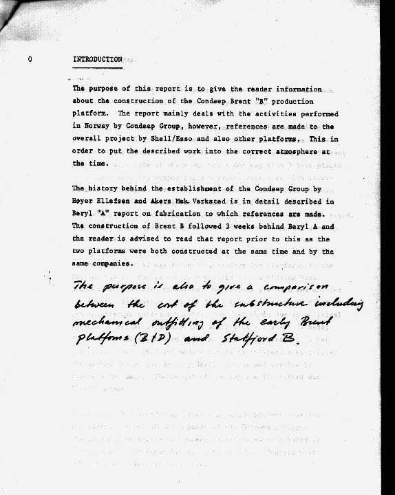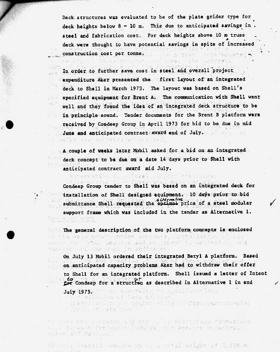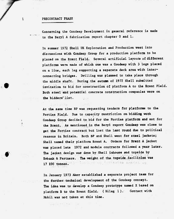 As part of his work for the Cost Committee Mr Ostlund prepared report on the construction of the first Condeep to be installed for Mobil on the Beryl field "Beryl A" and a report on the parallel construction of the first Condeep for Shell/Esso on the Brent field "Brent B". The initial part of the "Brent B" report is subject to review: Brent B front page , Brent B report Contents , Introduction , Precontract Phase , Minutes of meeting 07.02.1973 front page , page 01 , Development project org. , report page 08 , report page 09