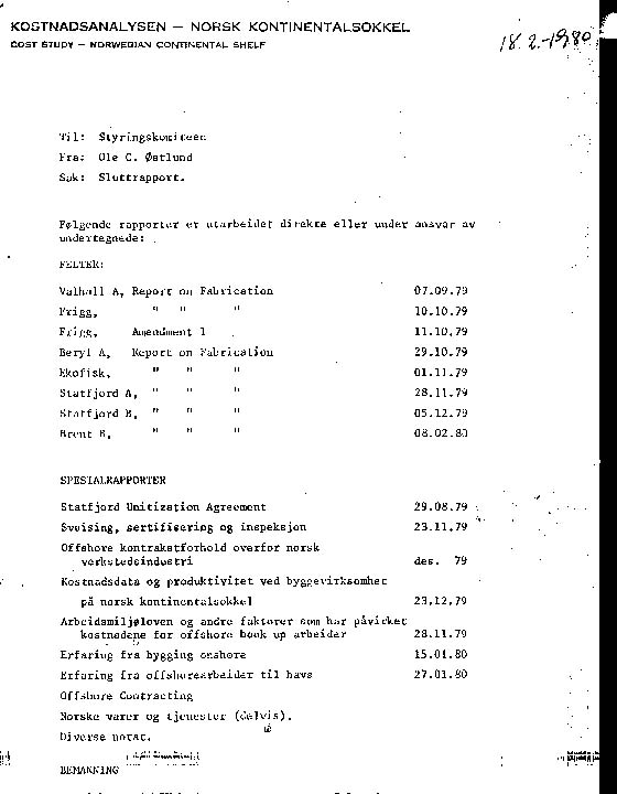 Added on July 6th 2004:The Cost Analysis came about as result of the Consevatives (Hoyre) strong criticism against the present labour Government for Statoils uncontrolled expenditures on the Statfjord Field Development. Labours Minister of Energy at the time Mr. Bjartmar Gjerde defected the criticism by suggesting a cost study to be carried out for all field developments on the Norwegian Continental Shelf. Mr. Ostlund had earlier in the fall of 1978 resigned from his position as Division Manager for Brownaker Offshore A/S . Brownaker a 50/50 joint venture between Brown & Root Inc of Houston and Aker of Oslo was at the time the largest construction operator on the Norwegian Continetal Shelf with construction work undertaken on Ekofisk and Statfjord. The creation of Brownaker Offshore A/S was highly political influenced as result of the crises in the mid 70-ties within Norwegian shipbuilding caused by the situation in the Midle East. Brown & Root who had been contracted for performong hook up work on Ekofisk and Statfjord was told by Norwegian Authorities to Norwegianize their opreation and at the same time Aker with its private major shearholder Fred Olsen was told to cooperate with a foreign Company experienced in the field. As such Brownaker Offshore A/S came about as a joint venture between two initial competitors. Mr. Ostlund was at the time Engineering Manager with Aker Offshore Conracting A/S. He had recently completed the successful start up of Aker offshore Contracting hook worh on Brent D on the British Continental Shelf. Mr. Ostlund was assigned to Brownaker Offshore A/S as Division Manager for Business Development and Contracts. His assignment to Brownaker commenced in spring 1977 until he resigned from Aker and Brownaker in fall 1978.