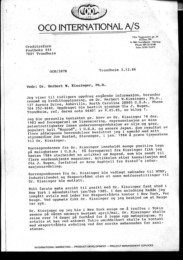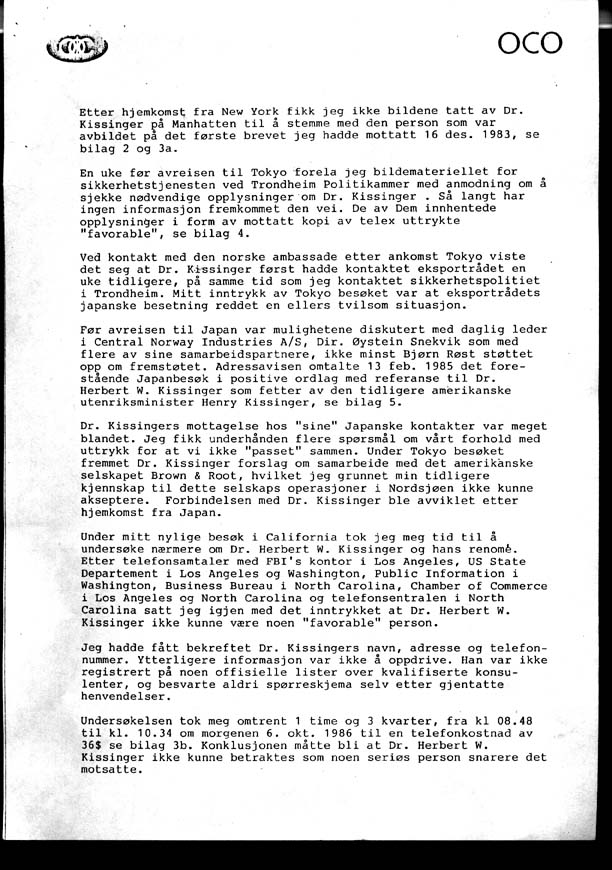 Jeg forstår nå innvirkningen av mine avslag, til Herbert Kissinger under vårt markedsfremstøt i Japan våren 1985, og senere under mine opphold i Houston høsten 1986 og 1987, om samarbeide med Brown & Root. Et samarbeide jeg ikke fant å kunne ta standpunkt til før samme selskaps rolle i terroraksjonen mot "Kielland" og korrupsjonssaken med Statoil og Kværner angående ingenørkontrakten på Statfjord B var nærmere avklart.