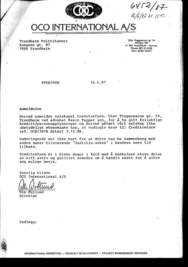 til Trondheim Politikammer av 16.06.1987, polititets saksnr 6452/87.