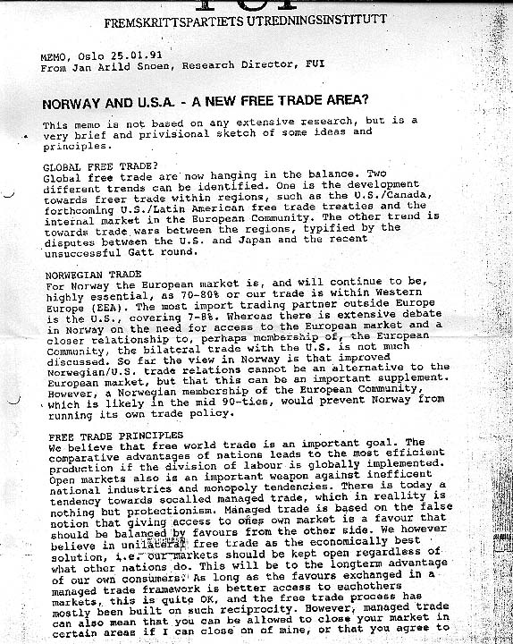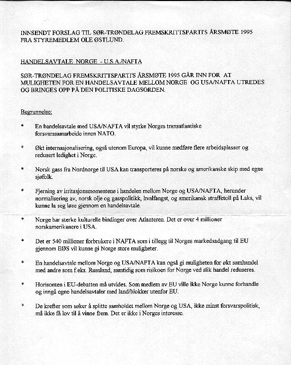 Det er utifra denne bakgrunn jeg i sin tid fremmet forslag om å utrede mulighetene ved et utvidet handelssamarbeide med USA. Et forslag Fremskrittspartiet landsmøte i 1995 bifalte med 2/3 flertall, men som Carl I. Hagen passivt motarbeidet - dengang, før og siden.