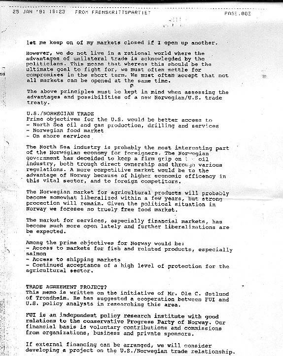 Her har norske politikere en utfordring. Et grunnlag er lagt gjennom mine tidligere kontakter med The Heritage Foundation i Washington og den respons jeg i den tid fikk på ovennevnte tanker. Ref. (1) brev fra Fremskrittspartiets Utredningsinstitutt av 25 januar 1991 side 1 og side 2, og svar fra Heritage Foundation av 28. februar 1991, side 1 og side 2. Ref også innsendt forslag til Fremskrtittspartiets landsmøte 1995, som ble vedtatt med 2/3 flertall mot Carl I. Hagen og sentralstyrets stemmer.
