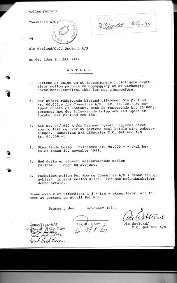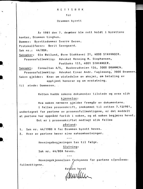 As to the Consultas case, the case dragged out, and was finally setled out of Court, ref Consultas1.JPG . The judge at Drammen Court handling the matter was Sverre Owren, ref Consultas2.JPG The question could be raised if Swerre Owren and admiral Nils Owren are related. Nils Owren at the time chairman on the Board of Brown & Root Norge A/S, ref ; Falk6.6.htm