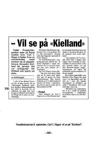 Under valgkampen i 1989 kontaktet jeg Fremskrittspartiets formann Carl.I.Hagen angående "Kielland". Jeg spurte om Fremskrittspartiet i regjeringsposisjon ville arbeide for at denne skamplett i norsk rettshistorie får et etterspill nasjonen kan være bekjent av i fremtiden. Det samme spørsmål som jeg stilte Hagen hadde jeg reist i en løpeseddel som ble utdelt til politikere og andre på Nordre gate i Trondheim to uker før. Der rettet jeg også søkelyset på sabotasjehandlinger mot norske oljeinnstallasjoner og om Fremskrittspartiet ville søke å avdekke kreftene bak, selv om det skulle vise seg å innvolvere KGB, Khadaffi, mafia eller andre. Under møtet på Royal Garden den 7. september 1989 lovte Hagen å se på "Kielland". Hagens svar er gjengitt i Trondheimsavisa påfølgende dag: - "Jeg skal med glede følge opp og få saken reist igjen, men jeg vil gjerne ha mere dokumentasjon. Min hovedholdning er at vi alltid ønsker å komme til bunns i sannheten. Jeg skriver gjerne under på en henvendelse til F.B.I."