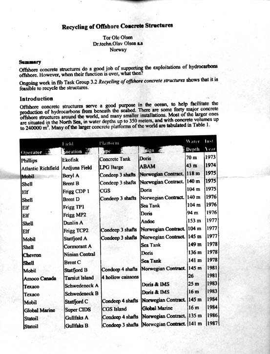 Ref. liste over leverte betongplattformer bygget i Norge, se vedlegg: ”Recycling of Offshore Concrete Structure” Dr. Tech. Olav Olsen