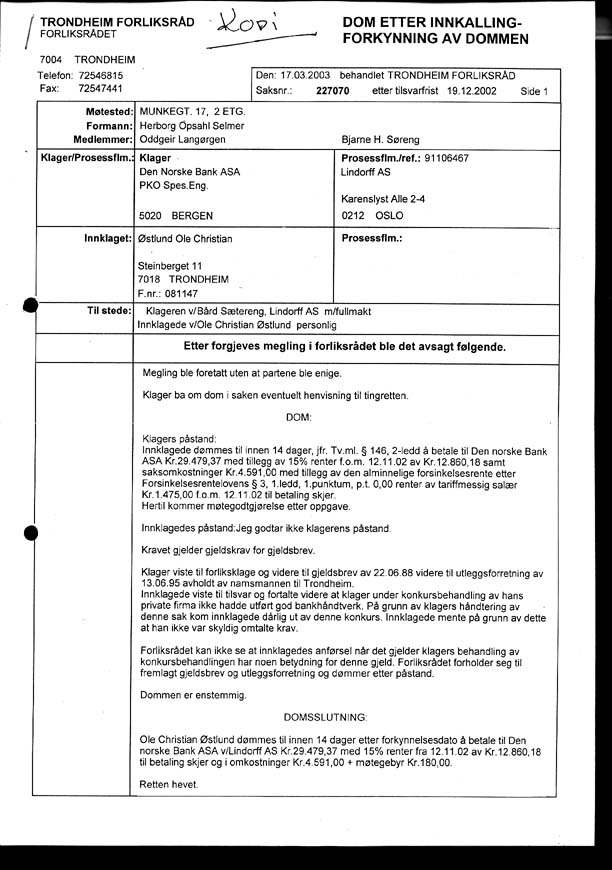 Trondheim Forliksråd (Conciliation Court) avsa 17.03.03 dom i saken mellom Den Norske Bank ASA og Ole Østlund. Forliksrådet fant å se bort fra motkravet fra Østlund mot banken. Motkravet var fundert i at bostyrer i konkursboet til Østlund's firma O.C.Østlund A/S tidligere hadde representert banken i en arrestsak mot et av O.C.Østlund A/S datterselskaper, Skansen Marina A/S, og således aldri skulle vært oppnevnt som bostyrer grunnet inhabilitet. Bankens representant i skiftesamling unnlot mot bedre vitende å påpeke forholdet. Følgene var at bostyrer ikke fulgte opp verdiene i boet, snarere tvert imot. Som styreformann og eneier i selskapet O.C.Østlund A/S anmeldte Østlund bostyrer til politiet for forskussling av boets verdier, dvs økonomisk svindel, uten at dette ble tatt til følge.