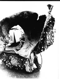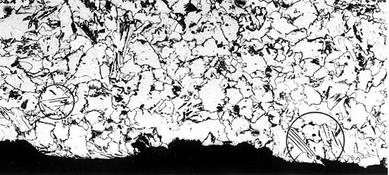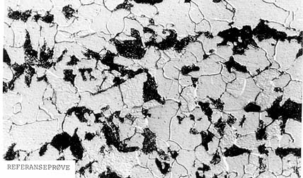 Chemical analyses of both test pieces proved the steel quality to be within the given material specification for Alexander L. Kielland corresponding to the material from other breaking points referred to in the Statoil reports. All test samples, the "reference piece" and seven samples from the "major test piece", ref. photo 2.2.3 were examined by a Reichert MeF3 metalmicroscope at 16-500 magnification. The steel structure of the basic material, "reference piece", is shown in photo 2.2.4. Further examination of selected areas was performed by a JEM 2000A electronmicroscope. Bainitt was found in all the seven samples from the "major test piece" as shown in photo 2.2.5, but not in the "reference piece". Hardness tests further confirmed the identification of bainitt. Twins were found in some of the samples but only on one side of the steel plate as shown in photo 2.2.6.
