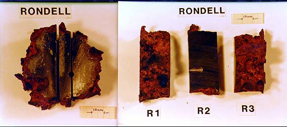 Test samples from the "Spiral" and the "Rondell" were chemical tested for material property purpose and compared to material from bracing D6 as reference. The "Spiral" was conform with D6. The "Rondell" deviated on carbon and vanadium compared to D6 but corresponded with test samples from D3 taken at the node close to the D-leg. This substantiates that the "Rondell" comes from a part of bracing D4 at node 4. Steel quality at the nodes differed from rest of the bracings for strength and welding purposes. Samples of the "Rondell" and "Spiral" are shown on photo 2.3.7 and photos 2.3.8 and 2.3.9.. One of the steel samples from the "Spiral" was examined metallografic with reference to testpoints outlined in fig. 2.3.3.