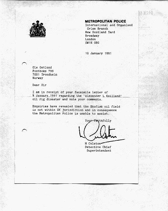 FALK International and its president Ole Ostlund has for years urged Norwegian authorities to contact FBI and Scotland Yard for information and support about the terrorist act on "Kielland" as the Norwegian Prime Prosecutor has proven to be incompetent in this matter. Ref summary in telefax of December 3rd 1997 from FALK International to the Minister of Justice at that time, Aud Inger Aure, and previous and later correspondance to Prime Ministers and Minister of Justice, ref Whats New under the list of updates.