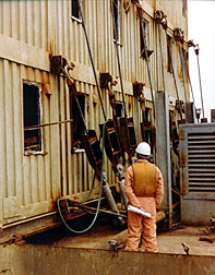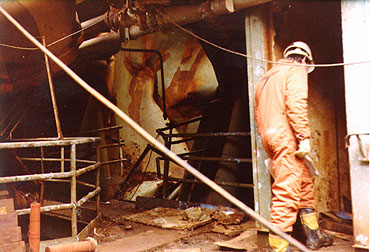 After the uprighting operation was completed and the rig secured ultimo September 1983 the platform was made ready for inspection. First the platform was searched for corpses which was one of the objectives for the uprighting. In order to do this the platform was cleaned out. Ceilings had fallen down during capsizing and uprighting attempts, furniture and loose equipment were in a mess. This work was done by operators controlled by the uprighting contractor Stolt Nielsen. The Stavanger Police was responsible for guard and security onboard. As soon as the platform was ready for inspection the Commission went onboard. Inspection by other parties were by the Commission organized to Oct. 13th 1983.
