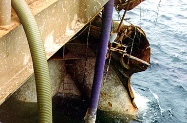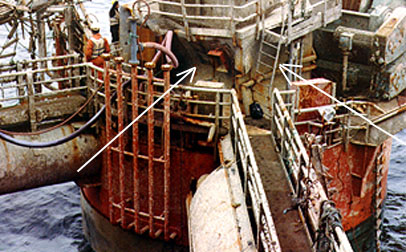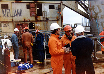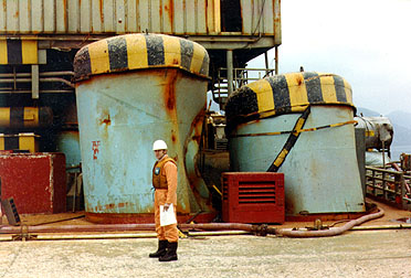 The deck and broken piping from the silos were covered by some brownish stuff which looked like mud. Samples were taken for examination. Tests performed at Rogalandsforskning gave no reliable answer. The ceiling of the deck was however not covered by this stuff. Conclusivly the stuff had not been floating around while the platforme was capsized. It is likely to believe that the starboard silos were emptied as part of the clean-up operation. There were signs that the bolts to the manholes on top of starboard silos recently had been opened. From a stability point of view one should expect an equal number of silos filled on each side, port and starboard. Why the starboard silos were filled and not the port ones might have had an effect on the tilting of the platform after the D-leg broke away. The platform tilted and capsized towards staboard. As such this might also have been part of the sabotage operation. Furthermore pictures taken of the platform shortly before the disaster shows the crownblock hanging in the top of the derrick. This further worsened the situation after the platform started tilting. Picture presented in left wing press Klassekampen. Was this also a part of the operation?