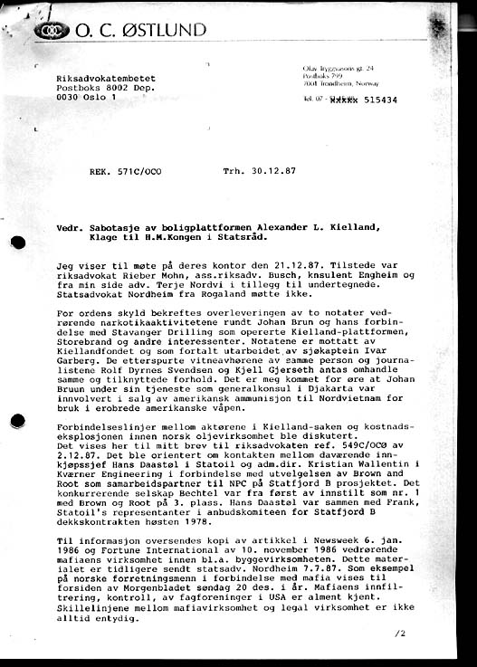 Letter to Norways Attorney General of December 30th 1987, sent by registered mail: Rik 30.12.87 page 1 Rik 30.12.87 page 2 Rik 30.12.87 page 3 Rik 30.12.87 Page 4; List of attachments Return