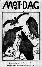 Mot Dag also started Arbeidernes Aftenskole (the Workers Evening School). They had their own publishing company. They infiltrated and couped student organization in High Schools and Universities. Their newsletter named Mot Dag was mainly addressed towards intellectuals. Mot Dag worked on the strategy of spreading its philosophy through intellectuals to the working class. As such Mot Dag became very active among students and comming workng class leaders. The same strategy was applied by the left wing AKP-ml (Workers Communist Party-Marxist Leninist) during the 1970s/80s. Several membes of AKP-ml were sons and daughters of Mot Dag members. Mot Dag was not a political party as such. They did not participate in elections, however in the 1920s they cooperated partly with the Norwegian Communist Party (NKP) and partly with the Labour Party (AP) dependent on which party was in most power. Mot Dag was looking for influence and power through their members and when the Labour Party(AP) in 1935 won the Parliament election for the first time negotiation was initiated and in 1936 Mot Dag officially assimilated with AP. It is very doubtful that Mot Dag totally was disintegrated. Their leader Erling Falk did not assimilate with AP. However Mot Dag vanished from public surface, but most likely Erling Falk continued his conspiracy work, recruiting, infiltrating and seeking influence not only in the Labour Party and the Athletic Federation but in any organization with impact on the Norwegian Society. As such the "Inner Circle" of Mot Dag became a secret organization with treads spreading out like a spider web (or "Mafia") seeking control over Norway and its foreign policy, from before the War until this day. For instance Mot Dag member Mr. Oscar Torp (1893-1958) was leader of the Labour Party (1923-40), Mayor of the city of Oslo in 1935, member of Parliament since 1937, Minister of Defence (1935-36), Minister of Social Services (1936-39), Minister of Finance (1939-03/42), Minister of Defence (03/42-11/45), Minister of Supply (11/45-01/48), Prime Minister (11/51-01/55), President of Parliament from 1955.