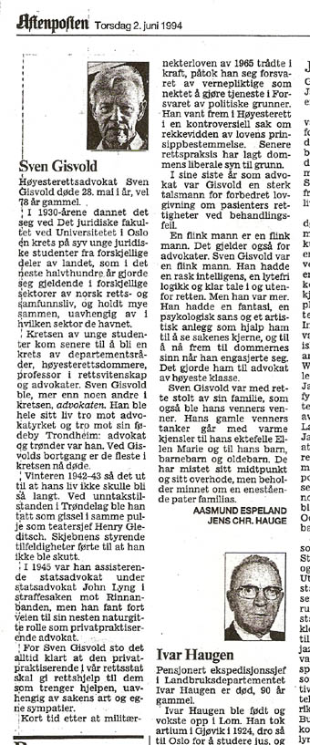 Torsdag 2.juni 1994 sto der å lese en nekrolog i Aftenposten over advokat Sven Gisvold skrevet av Jens Chr. Hauge og Aaamund Espeland, hvorfra siteres;