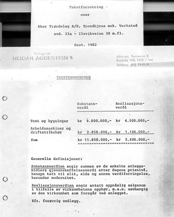 Til grunnlag for forhandlinger om overtakelse og oppstart av ny virksomhet ved Aker Trøndelag avdeling Ila, fra og med 01.09.1983 Ila Stålindustri A/S, vises til takstforretning av september 1982 fra firma Sivilingeniør Reidar Agdestein A/S. Takstsammendraget viser en substansverdi stor kr. 11.858.000,- og realisasjonsverdi kr. 5.606.000,-